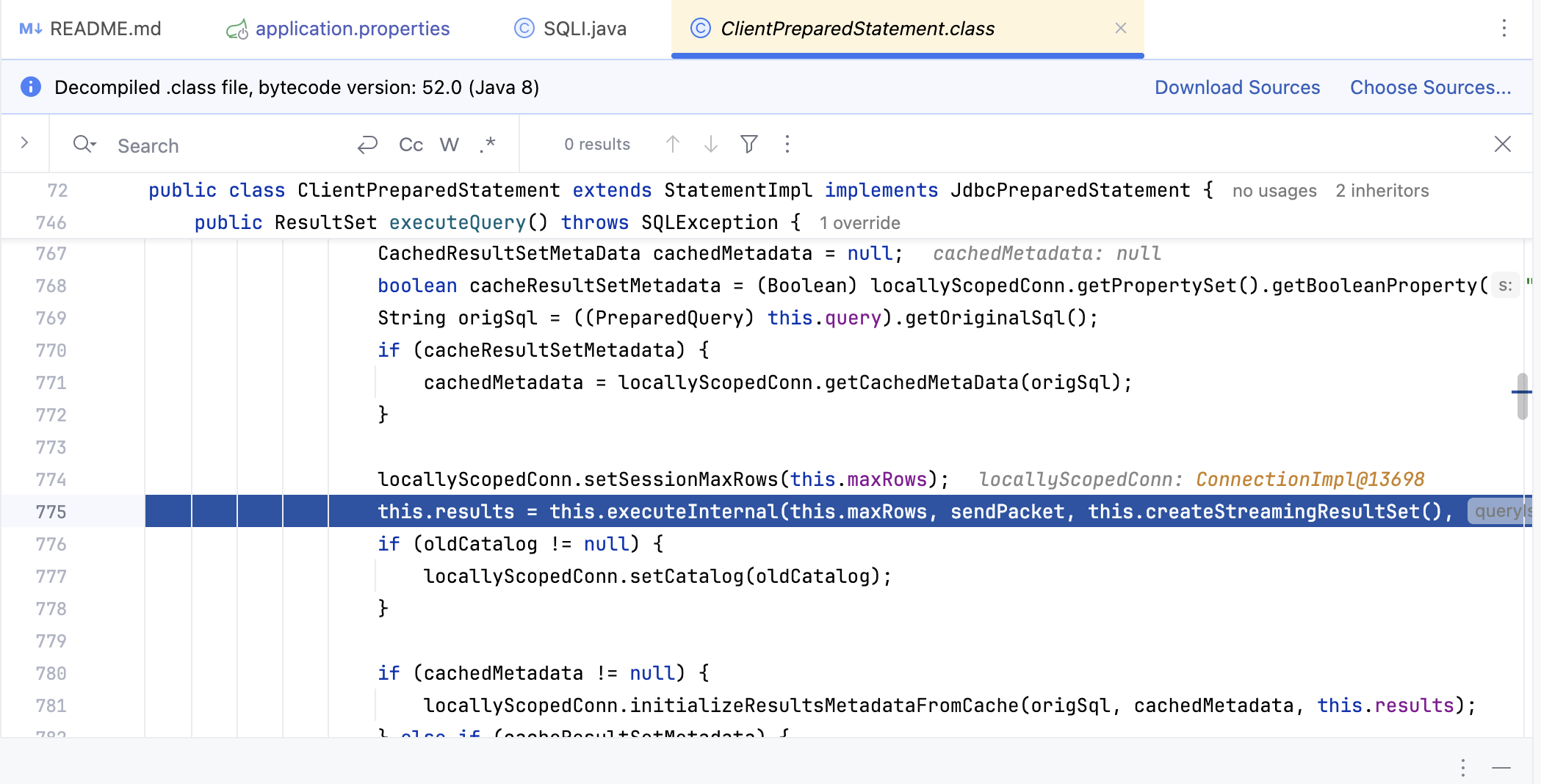 进到executeQuery()发现此时的语句后半部份有一个转义