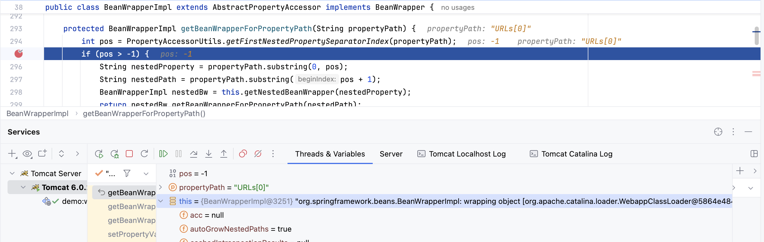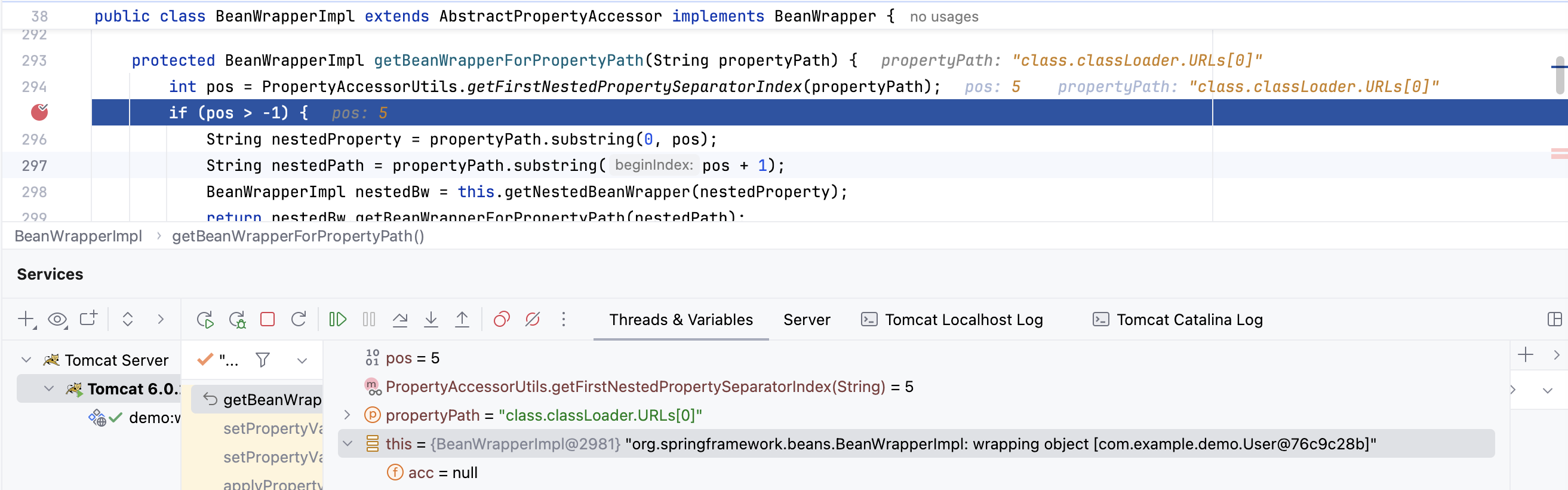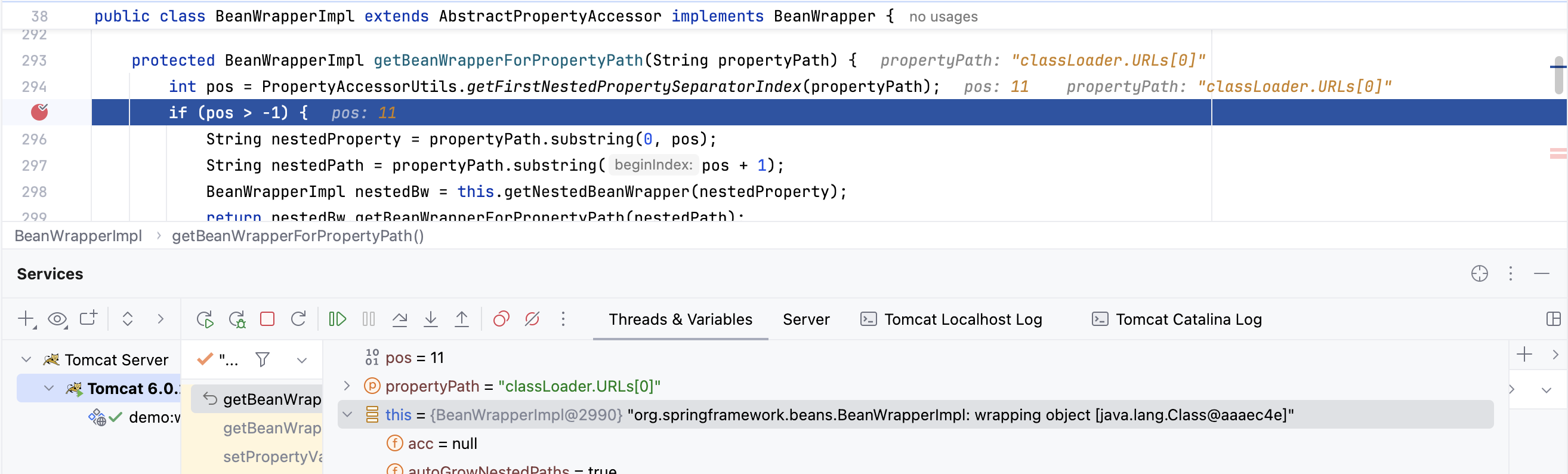 **[org.apache.catalina.loader.WebappClassLoader@5864e484]**,知道当前是pos为-1,也就是propertyPath为URLs[0]最后一个时,当前的BeanWrapperImpl变成了WebappClassLoader