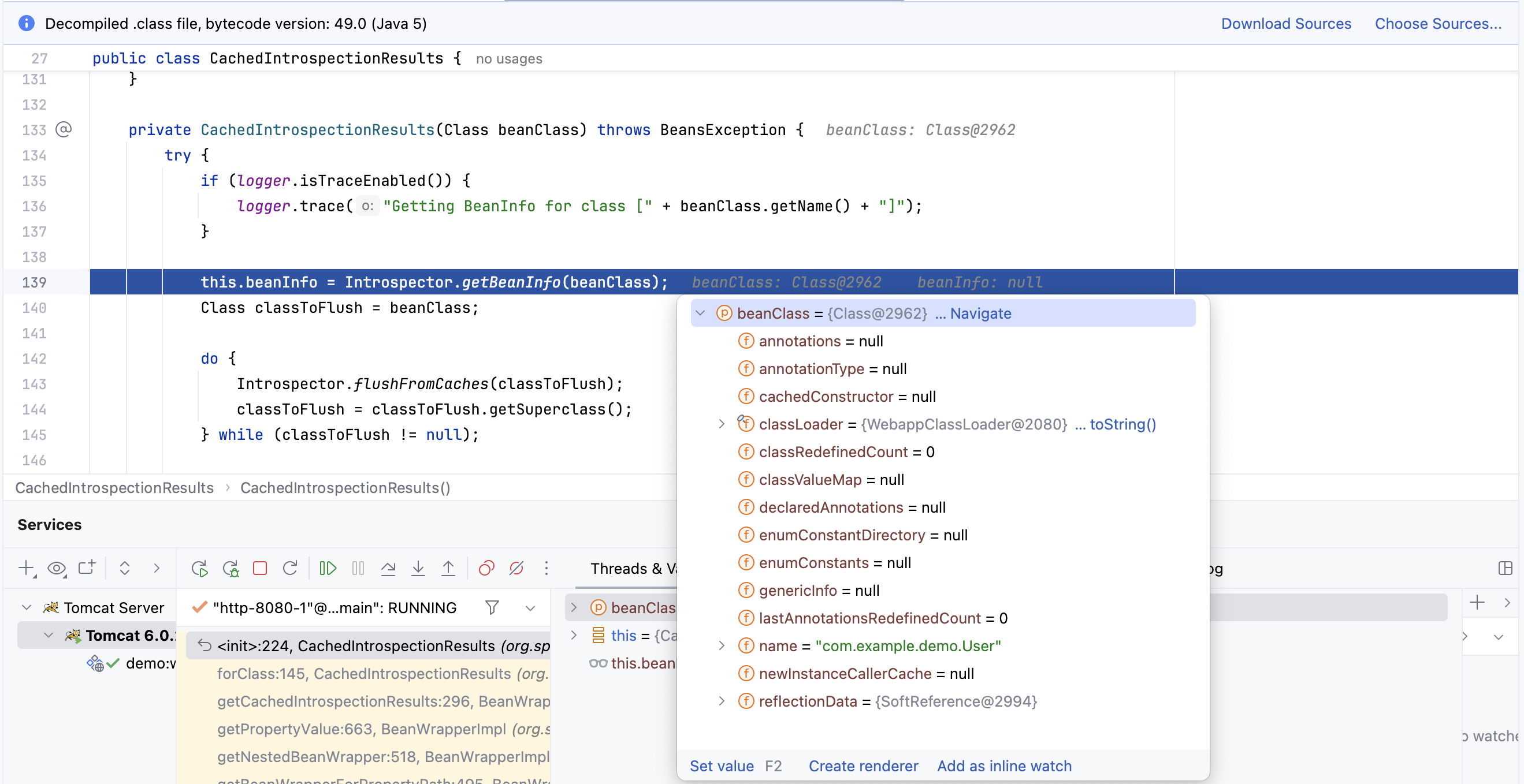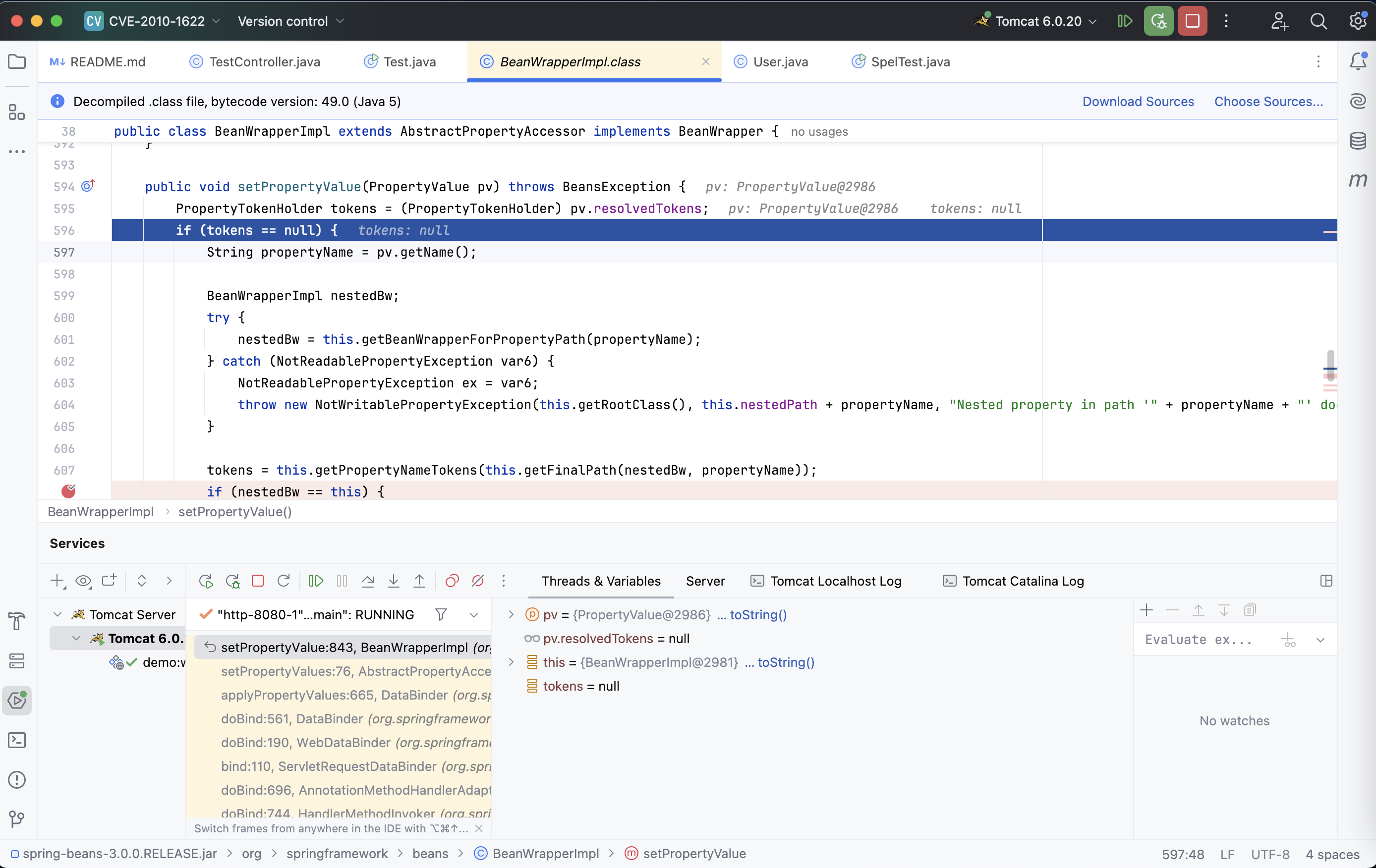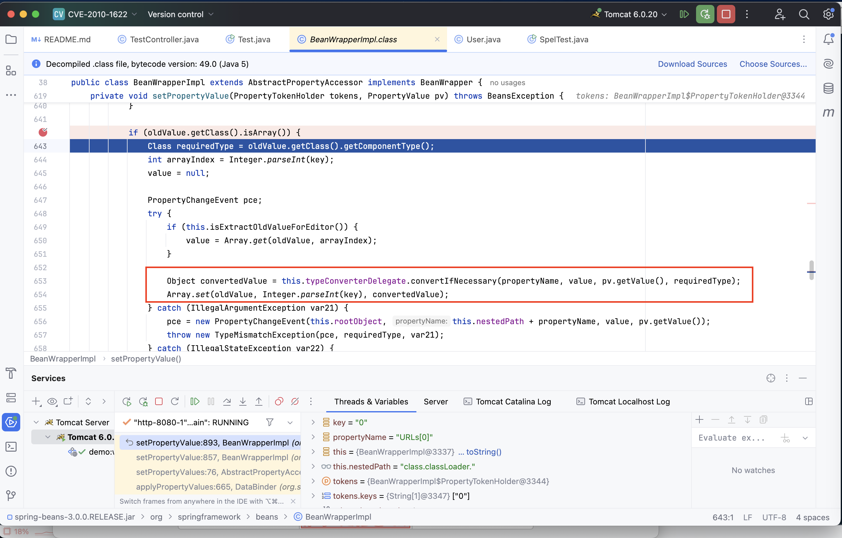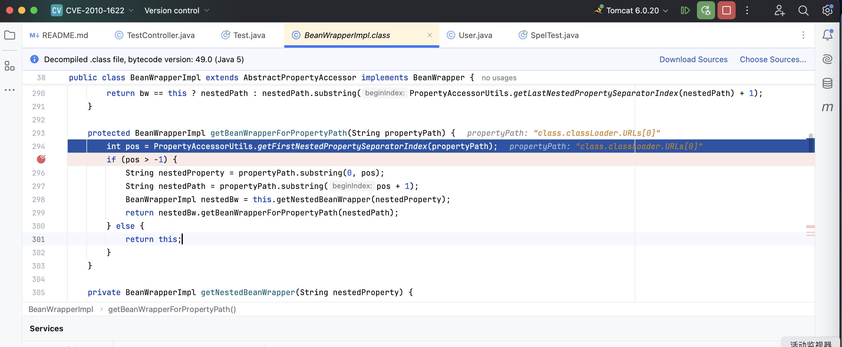 **[org.apache.catalina.loader.WebappClassLoader@5864e484]**,知道当前是pos为-1,也就是propertyPath为URLs[0]最后一个时,当前的BeanWrapperImpl变成了WebappClassLoader