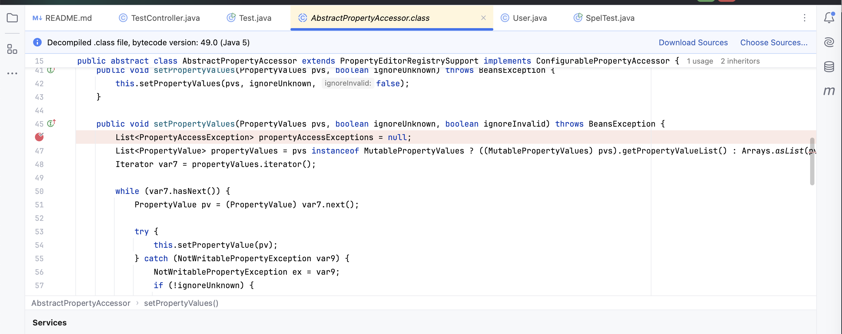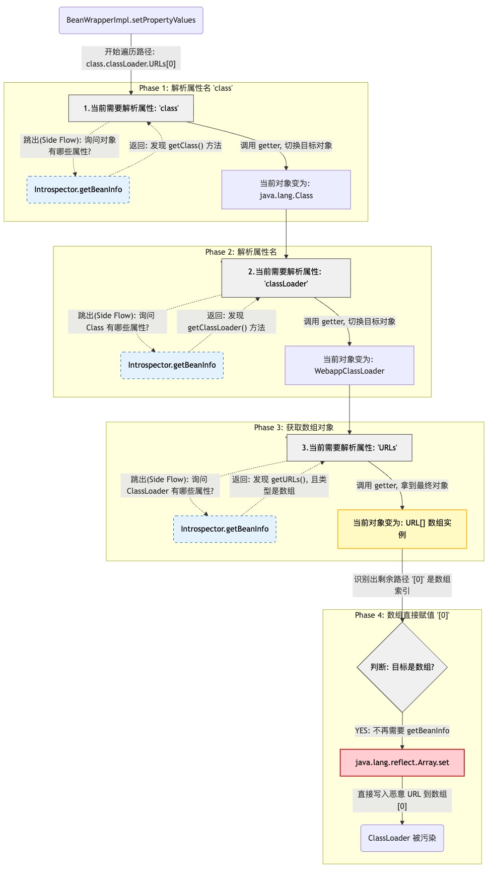 BeanWrapper拿到参数名,例如class.classLoader.URLs[0],它会将其解析为一个嵌套路径。递归获取属性 (Nested Navigation): 它必须一层一层地“剥开”对象。
