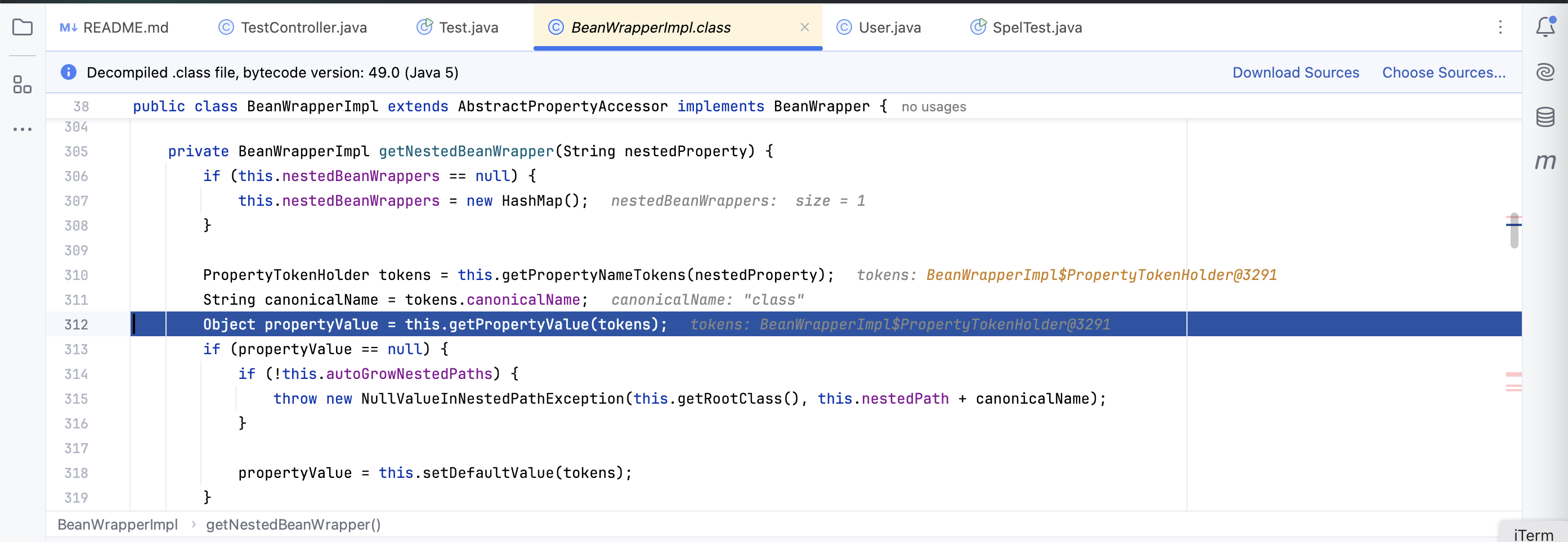 BeanWrapperImpl nestedBw = this.getNestedBeanWrapper(nestedProperty); 这句里面跟进,有一个getPropertyValue(token)