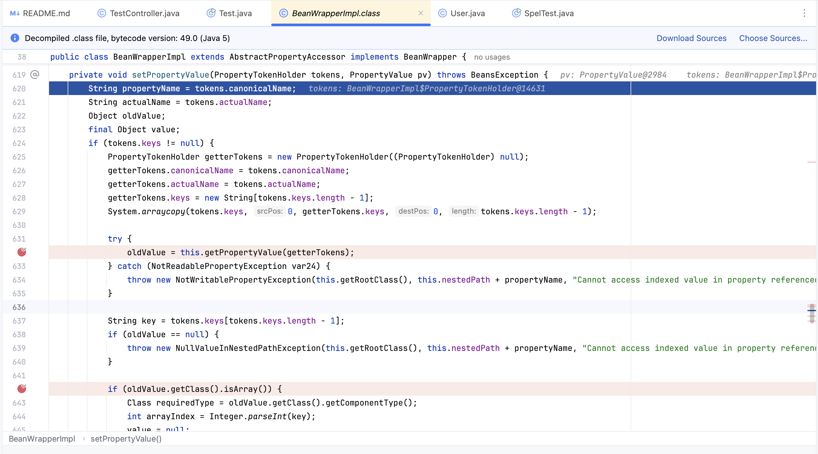 回到前面的获取到nestedBw,后面会再进入一次 nestedBw.setPropertyValue(tokens, pv);