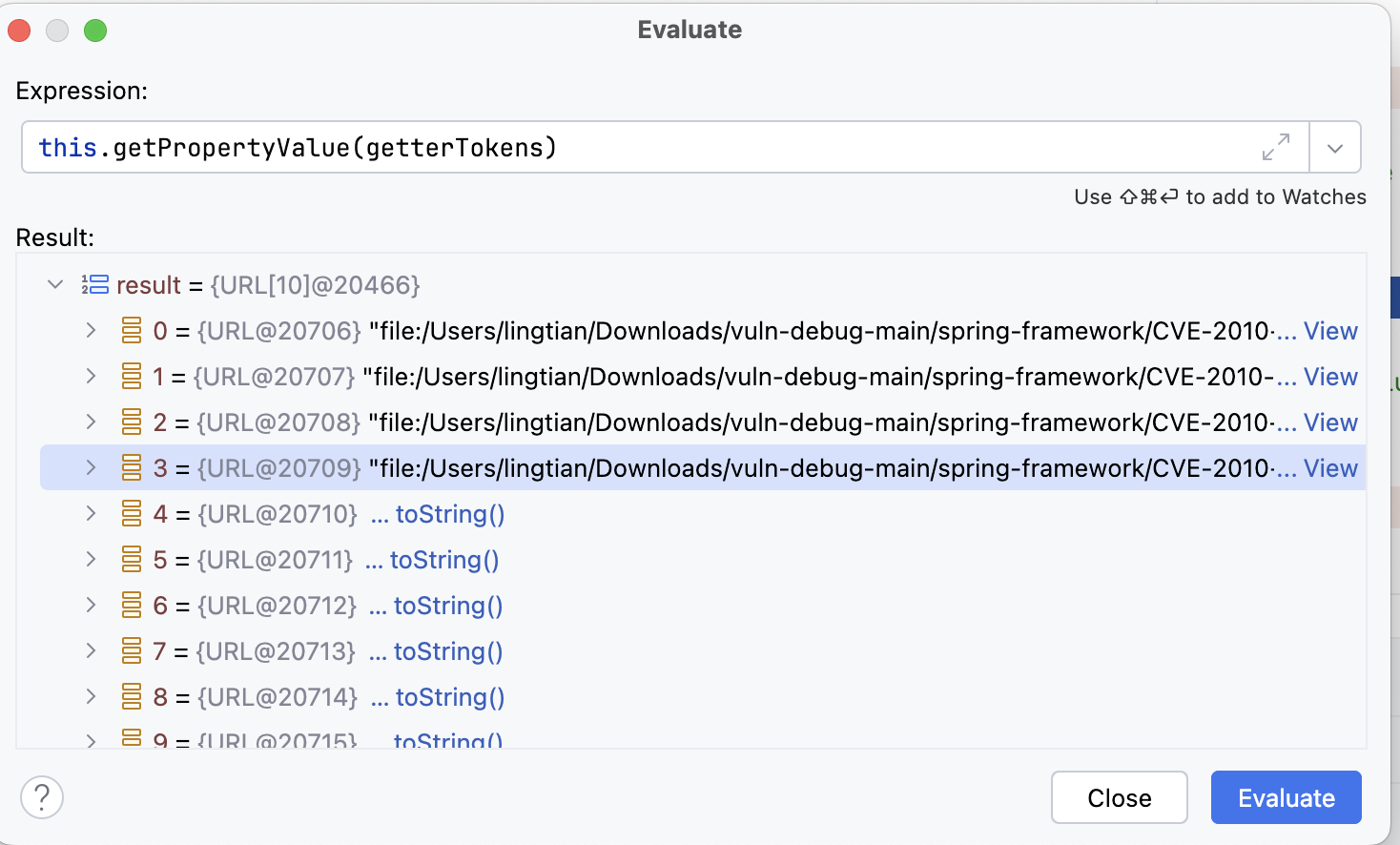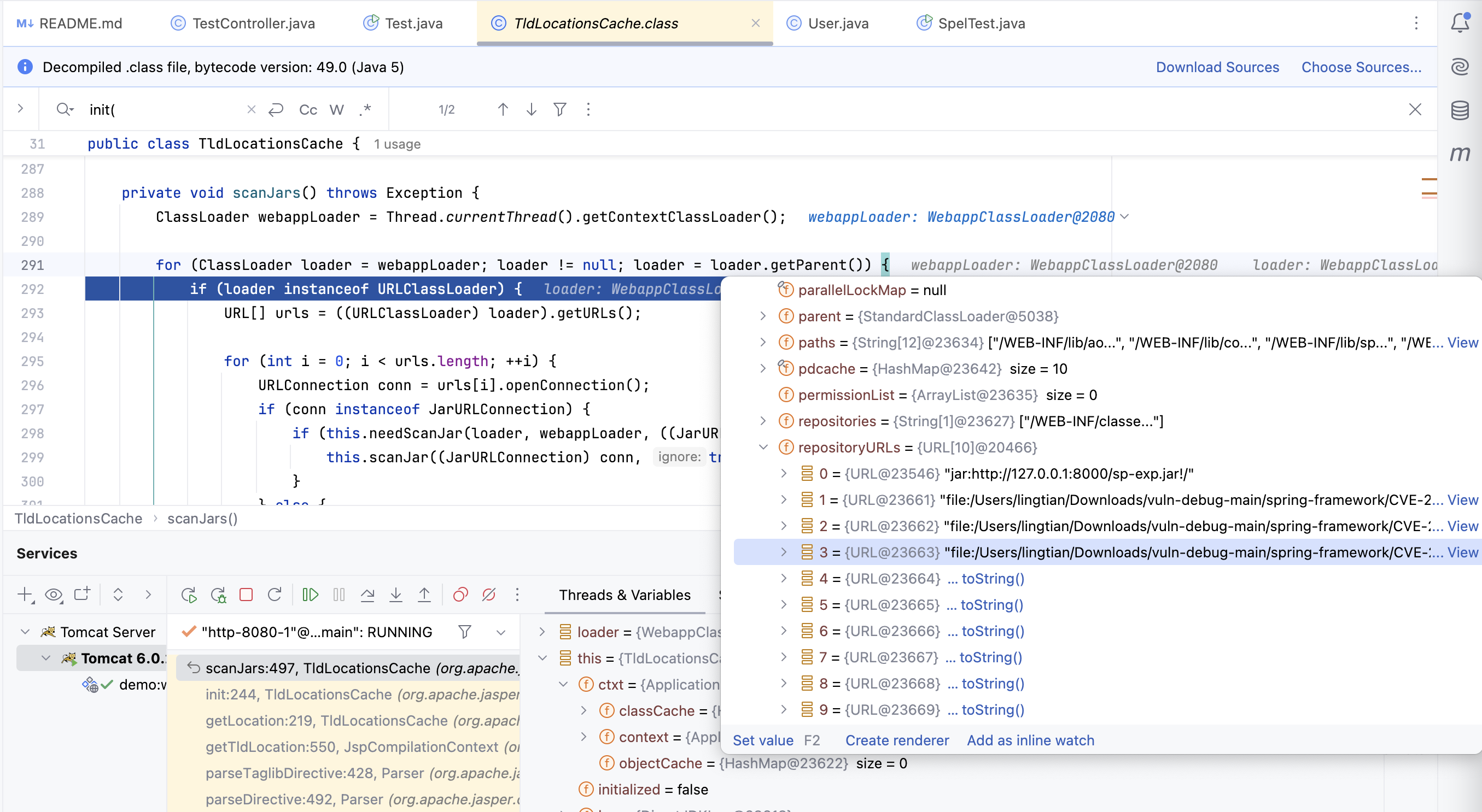 URLs[0]: 切换目标到WebappClassLoader。询问:“你有URLs属性吗?”- 回答:“有,我有