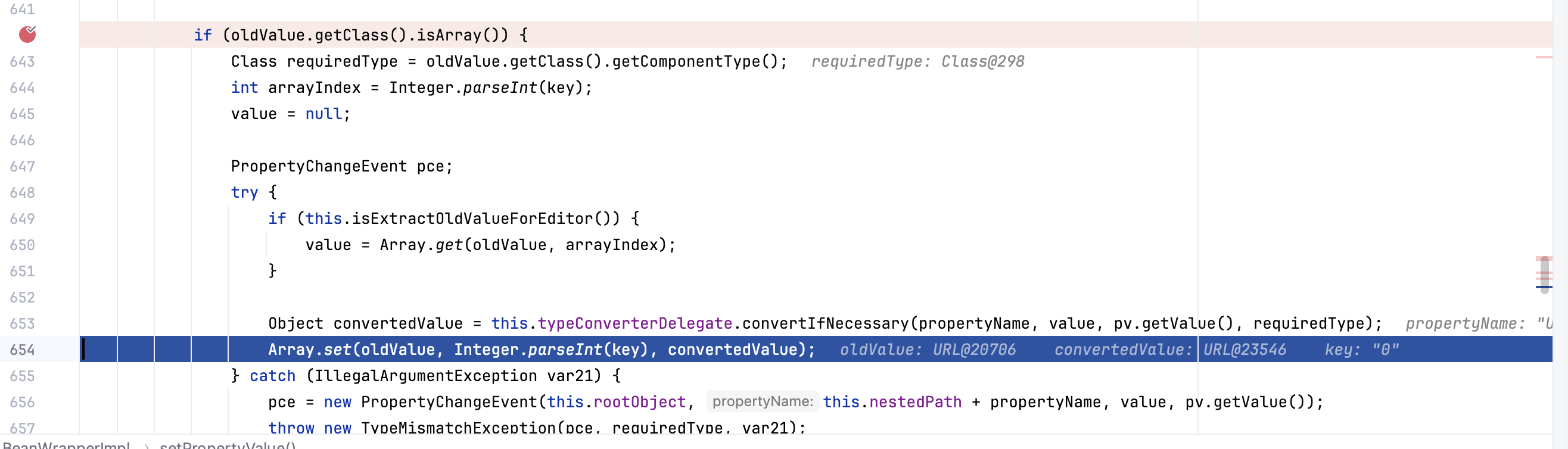 下一步是在 if (oldValue.getClass().isArray()) 这个判断里(目前是,会进入进入if)直接调用底层赋值把我们payload的内容set进去